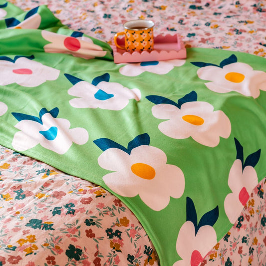 Retro Floral Meadow Green Large Fleece Blanket/Throw - Enamelhappy